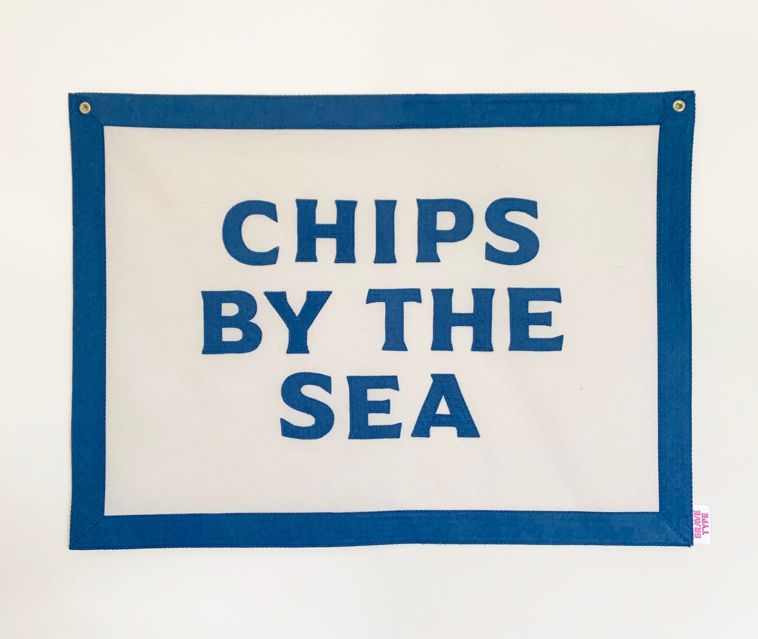 Appliqué banner on cotton canvas with cornflower blue felt letters and gold eyelets.